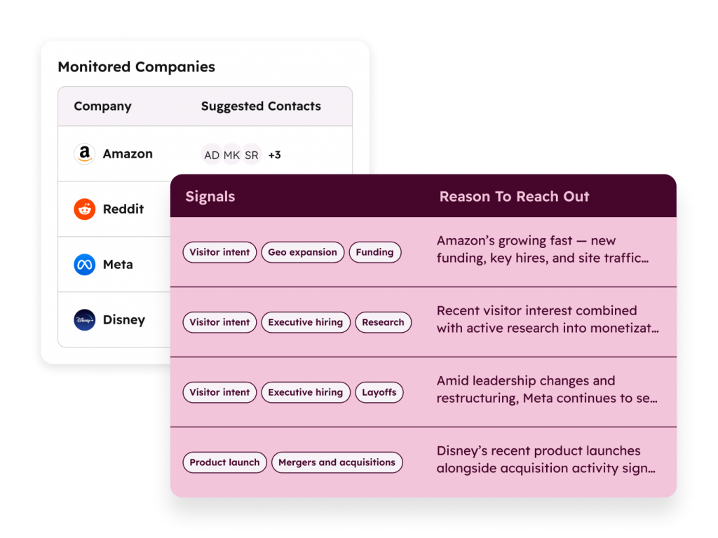 - 🔍 Monitors for buying signals (funding, hiring, tech adoption)